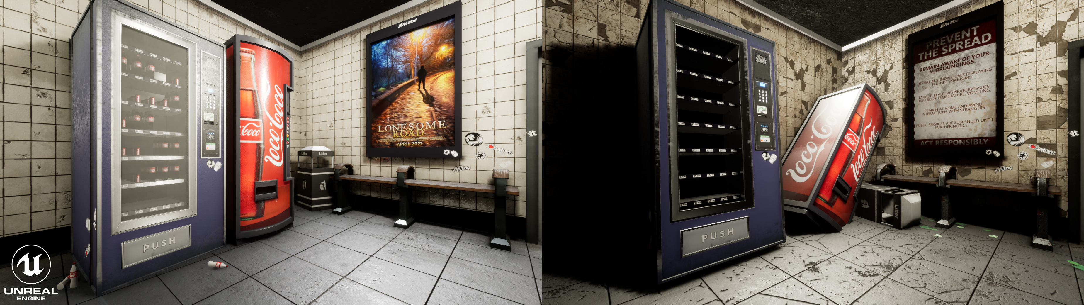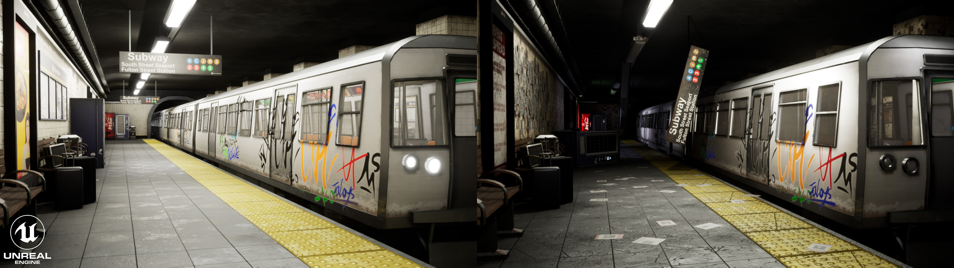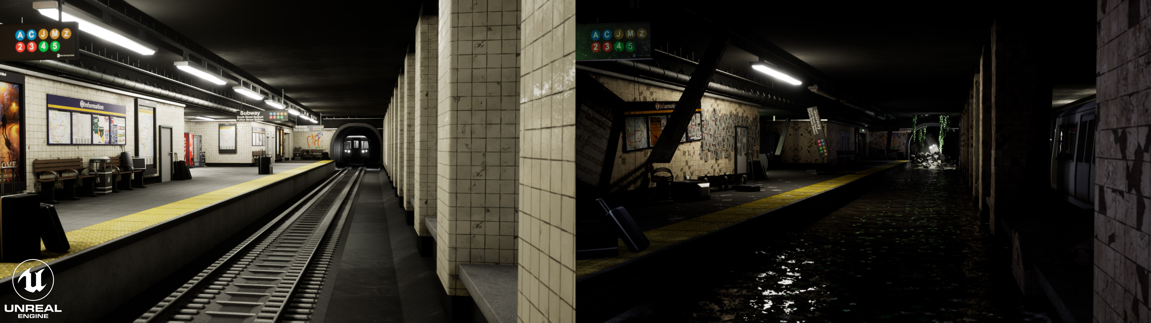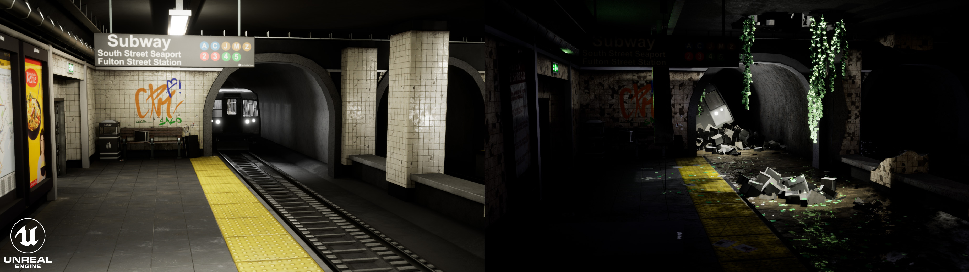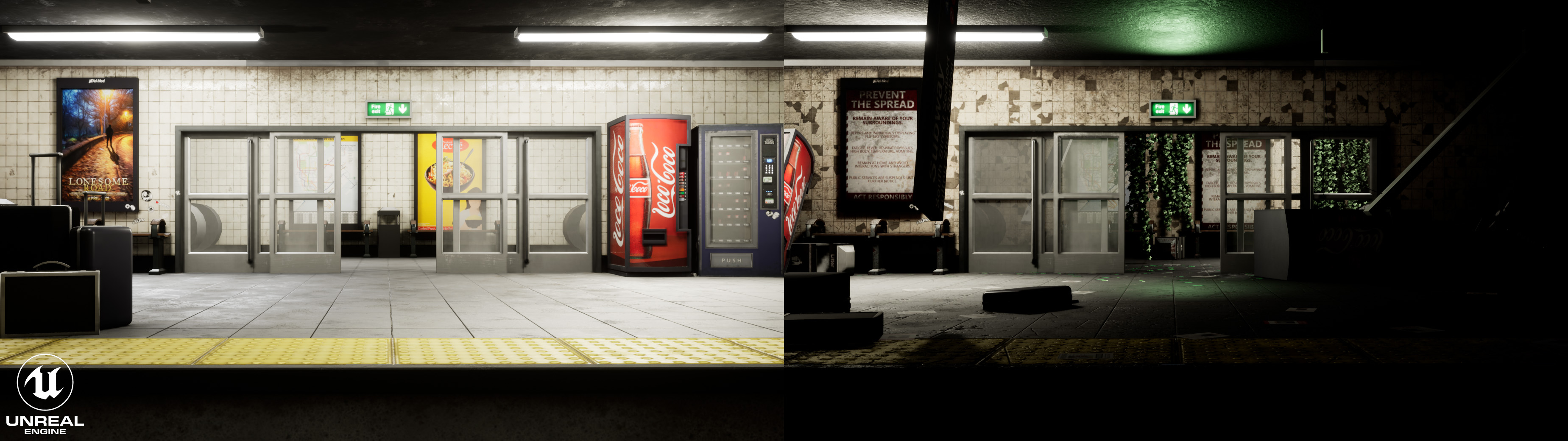 Focused on a New York subway station this scene was developed to explore how age, destruction and overgrowth affect an interior environment. After creating an intact subway station for the first half of the project series, it was then developed to push structural changes and visual storytelling with a scene which has been “Reclaimed by Nature”.